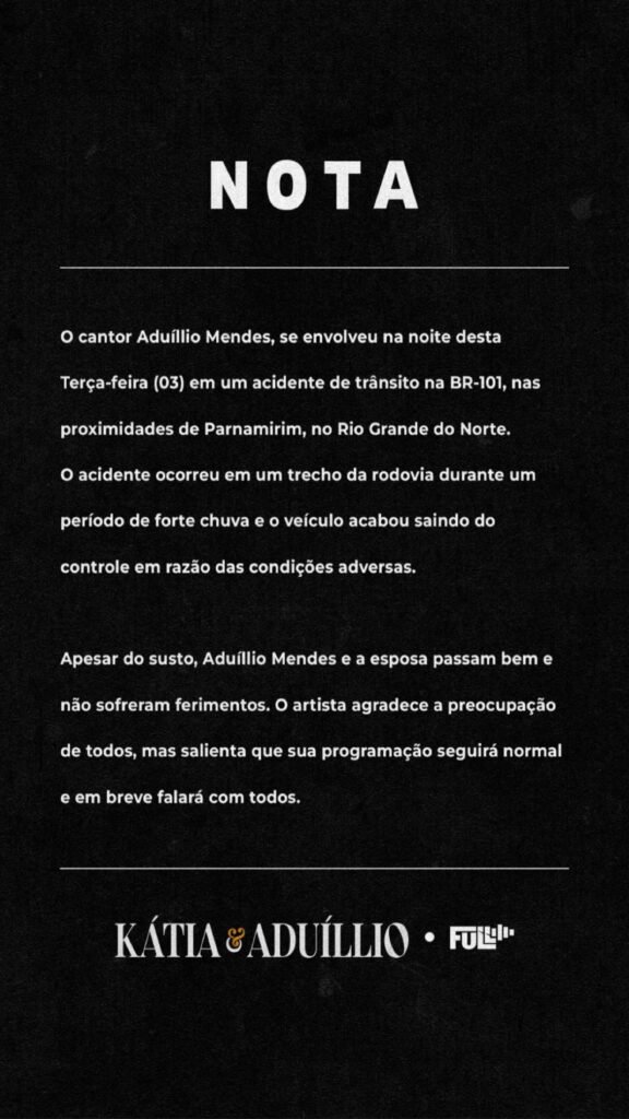 Em nota publicada nas redes sociais, a equipe informou que, apesar do susto, o casal passa bem e que a agenda será mantida. Natural de Choró (CE), Aduílio já integrou bandas tradicionais do forró, como Mastruz com Leite, Magníficos, Caviar com Rapadura e Forró Moral.